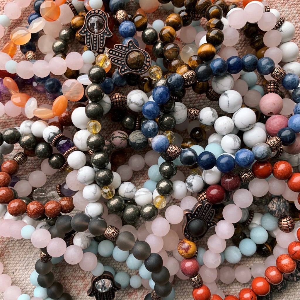I make all the jewelry at home in my sacred space. My process is to sit on my comfy floor pillows, light my favorite incense or candle on occasion, and put on some crystal jewelry myself to keep me in a peaceful, creative mindset. I’m usually watching anime while I create too.